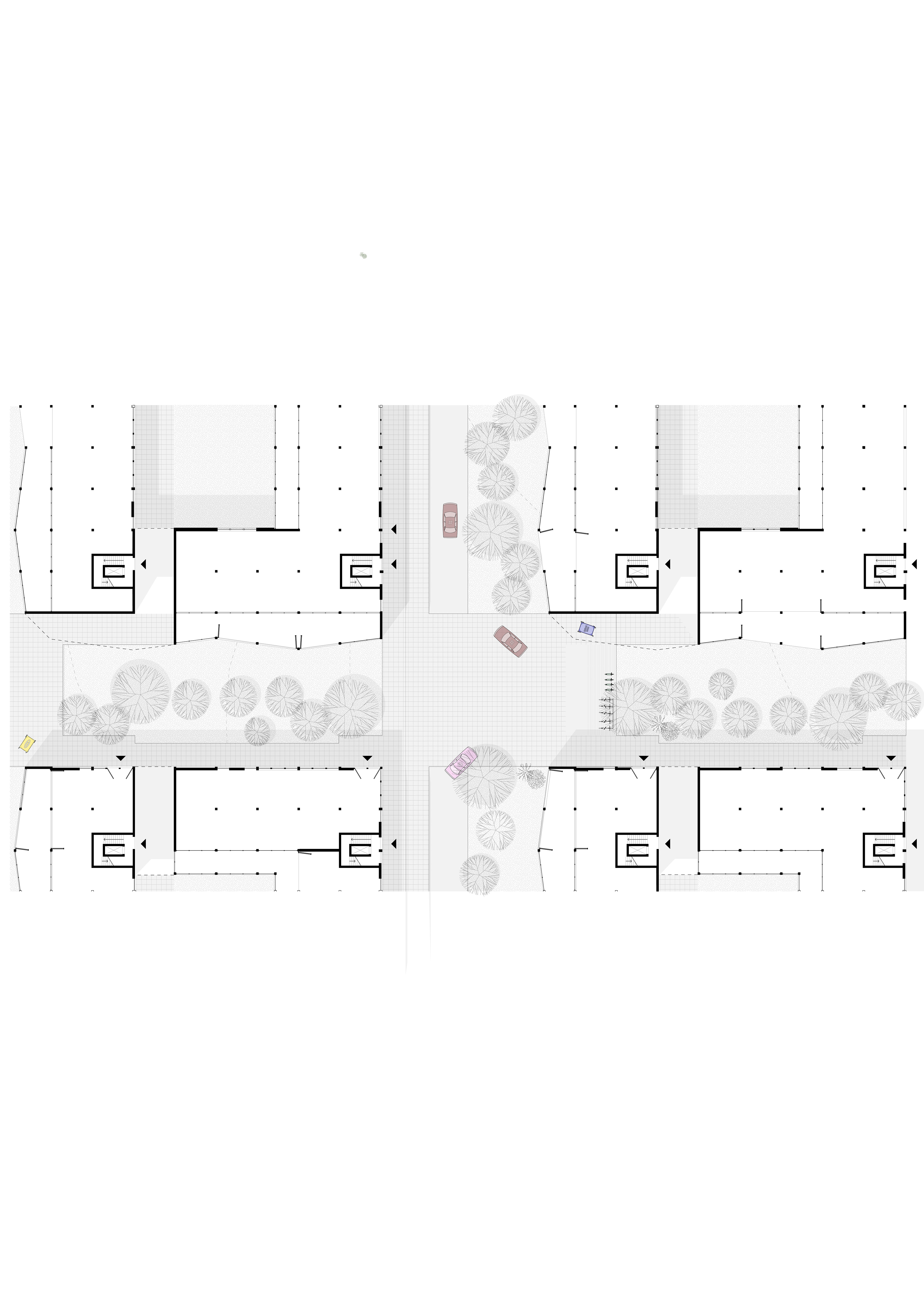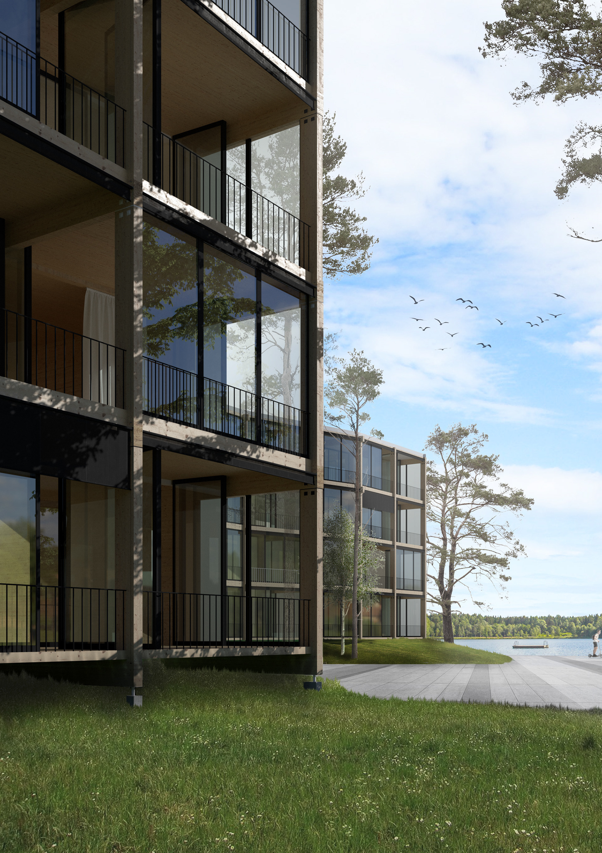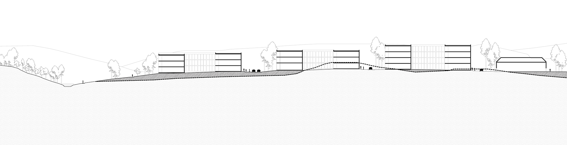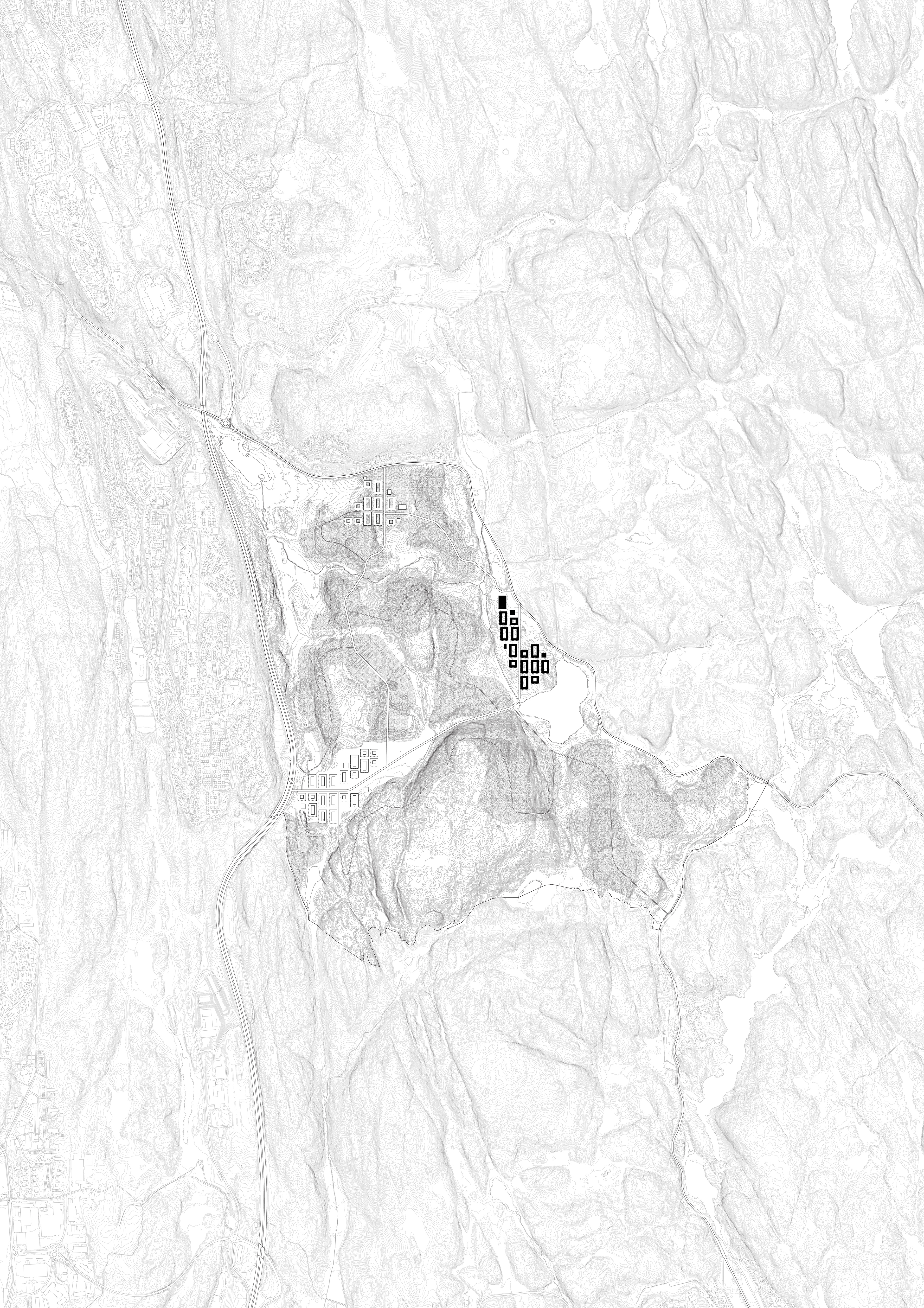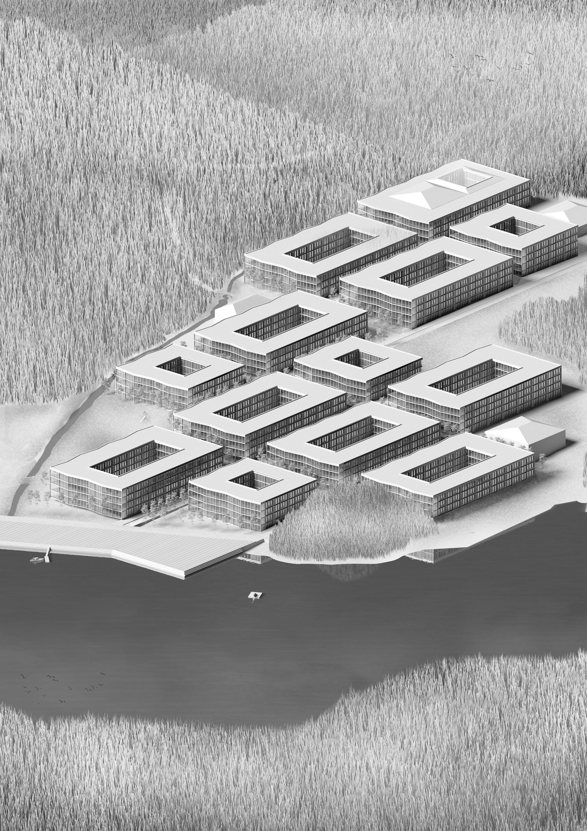 Ved å bygge urbane knutepunkter med høy boligtetthet som knytter seg på eksisterende infrastruktur, bevarer vi naturkvaliteter som finnes i området. Innsjøer, kulturlandskap, og umiddelbar nærhet til naturreservatet i Østmarka. Strukturer for autonome kjøretøy faller naturlig og intuitivt mellom kvartalene, og muliggjør av-,på-stigning og pick-up-points for varelevering mellom byggene.